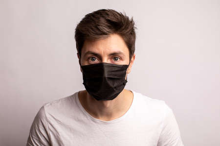 studio shot of a young man wearing a black mask, looking at camera, isolated on white background