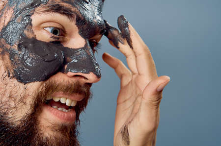 a man applies a clay cosmetic mask on his face, a portrait, an empty space for copying.