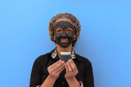 Woman with mud mask holding a jar of cream. Shot with blue background