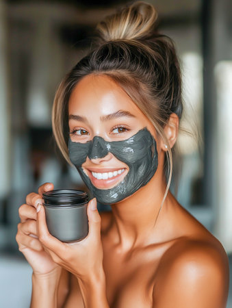 A young woman has put a mask on her face and is holding a jar in her hand. She smiles and looks at the camera. Image for advertising