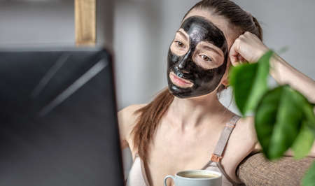 Young woman with a cosmetic black mask on her face and a cup of coffee is using a laptop. Concept of skin care at home, lifestyle.