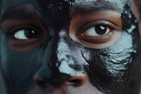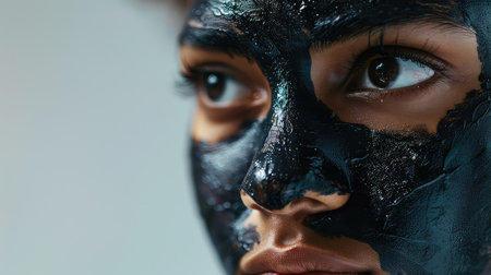 A woman decorates her face with charcoal as part of skincare routine. Concept Skincare, Charcoal Face Mask, Beauty Routine, Self-Care, Natural Ingredients