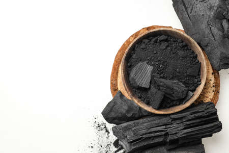Charcoal, powdered charcoal and leaves on white background