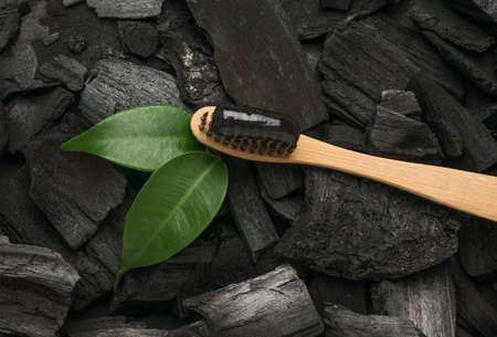 Bamboo toothbrush with gel toothpaste and two green leaves on a charcoal background. Teeth whitening and dental care products.