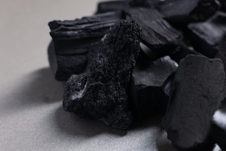 Pieces of black coals on gray table, closeup