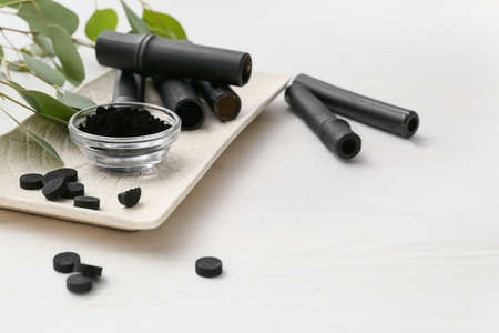 Bowl with activated charcoal tooth powder, pills and bamboo sticks on white background