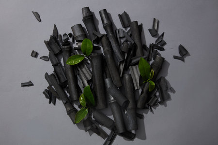 View from above of a pile of activated charcoal sticks. Few fresh green tea leaves featured. Activated bamboo charcoal is a great material in the cosmetic and beauty industry