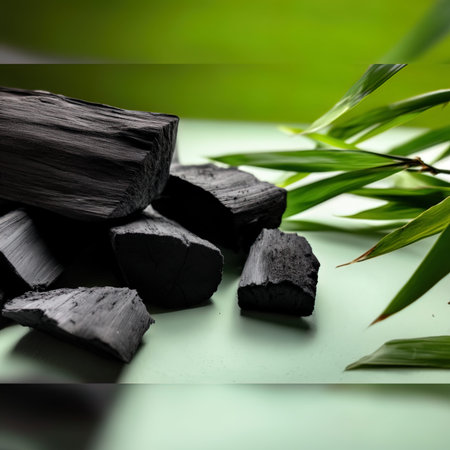 Natural charcoal for spa and aromatherapy with green bamboo leaves.