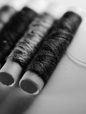 spool of thread in black and white mode. slow fashion and home sewing concept