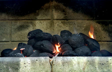 Glowing wood charcoal with small flames and smoke in a black grill, preparation for a barbecue, copy space, selected focus, narrow depth of field
