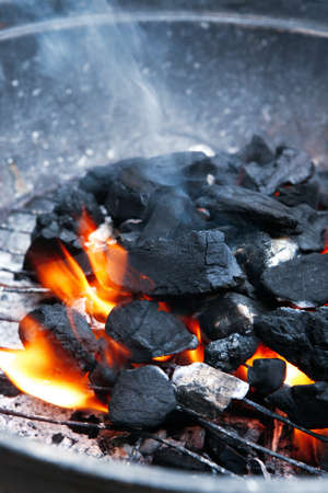 Lighting charcoal in a barbecue showing coals turning white and flame