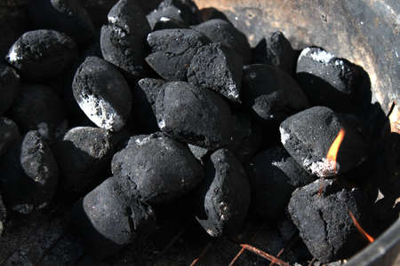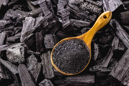 Group of charcoal black color made from real wood in studio close-up shot which use for cooking or absorb odor in room or refrigerator. And use in some cosmetic industry.