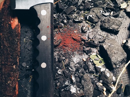 Barbecue with burning coals for cooking meat outdoors. Summer atmosphere and hiking with friends. High quality photo
