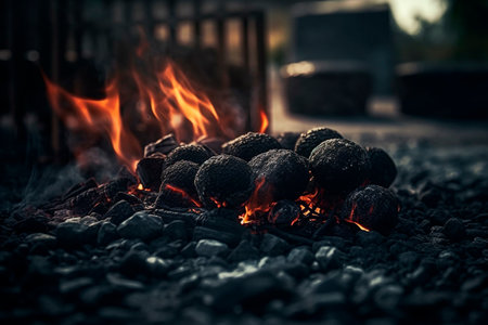 Burning charcoal with glowing embers and sparks on metal grill, creating warm and fiery atmosphere for outdoor cooking or barbecue
