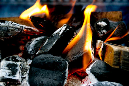 Close up of fire and embers on hot coals for grilling or barbecue banner design background