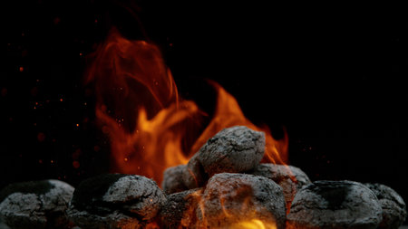 Close up of glowing fire and embers on hot coals for grilling or barbecue banner design
