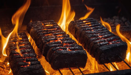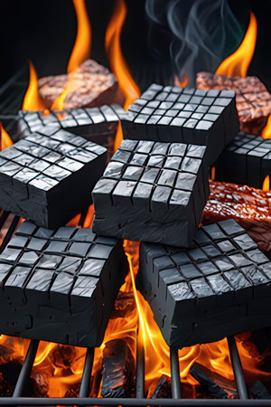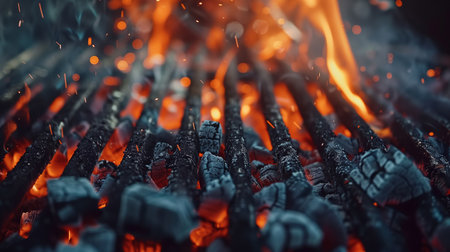 Glowing charcoal sits on a grill, surrounded by lively flames during a warm summer evening. The fire flickers and crackles, promising delicious food awaits as friends gather around.