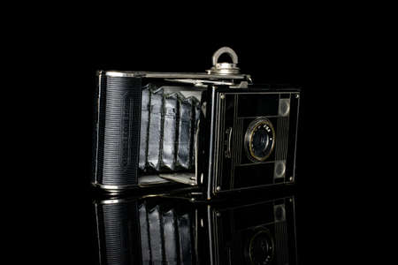 One whole vintage camera isolated on black glass