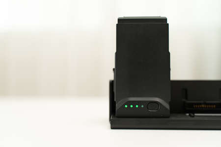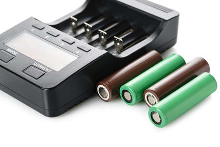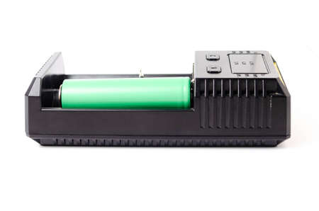 A black charger for two 18650 batteries. A green and brown 18650 battery on a white background next to the discharge, on charging. Male hand puts the battery on charge