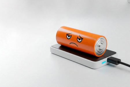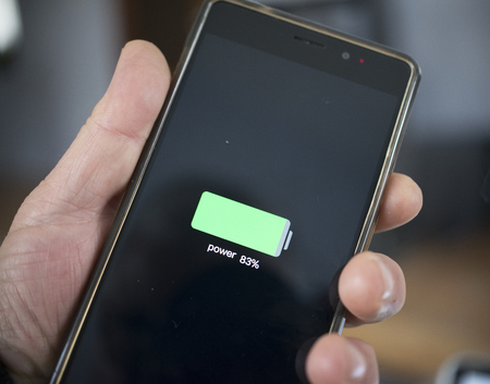Smartphone is charging with backup battery or white power bank on the desk wooden table