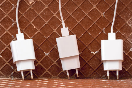 Three white cable phone chargers on a brown tiles background