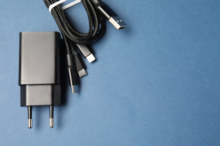 Black charging block with a cord for a mobile phone on blue background. Keep the battery charged on your device anyway you go. Technology connect close up. Three different ends of one cable.