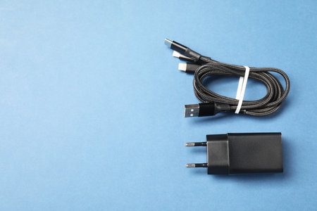 USB power adapter and triple charge cable on light blue background, flat lay. Space for text