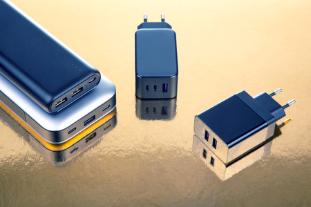 Power bank and charging plug on a golden background. Electronic devices for charging gadgets