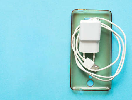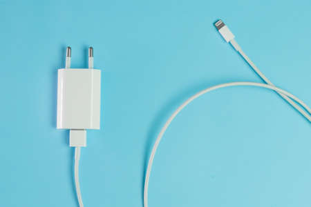 phone charging and wire on a white background closeup top view photo