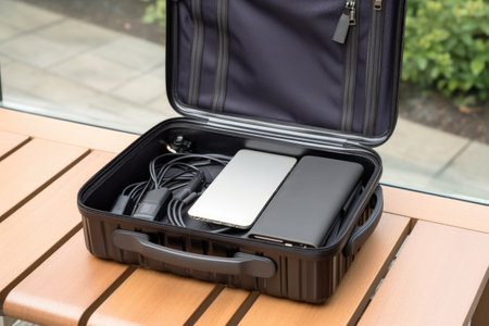 open suitcase containing travel adapter and charging cables, created with generative ai