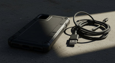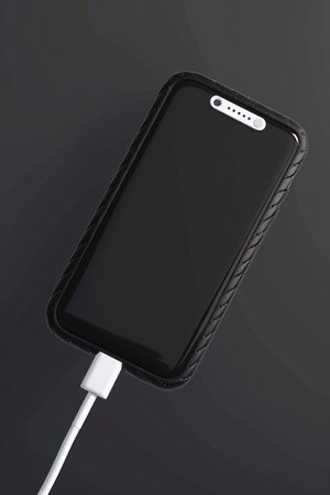 detail of smartphone charging from a portable power bank on a white background with prominent shadows