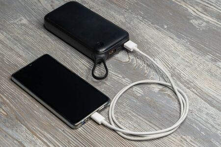 Power bank smartphone. Mobile phone or smartphone battery charging from portable powerbank with white usb cable. Modern technology concept in top view