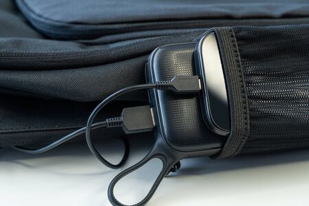 Black power bank connected with USB cable. Charging smartphone with power bank. Shallow depth of field focused on power bank display.