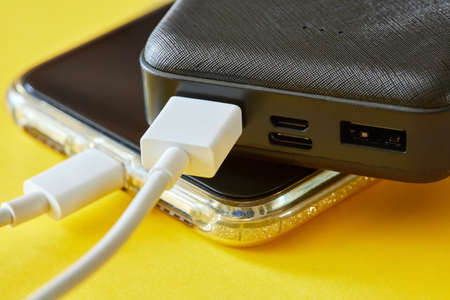 Power bank charges smartphone using a USB cable on yellow background. Close-up, selective focus