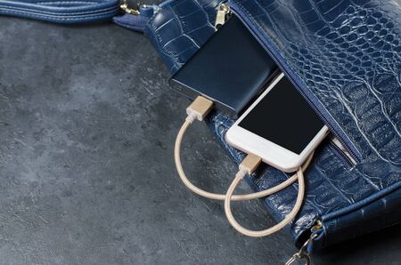 Blue Power Bank and telephone in the womens bag. Dark grey concrete background. Copy space