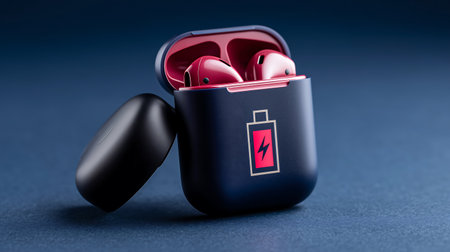 A sleek, matte black wireless earbud case rests on a cool, textured gray surface.