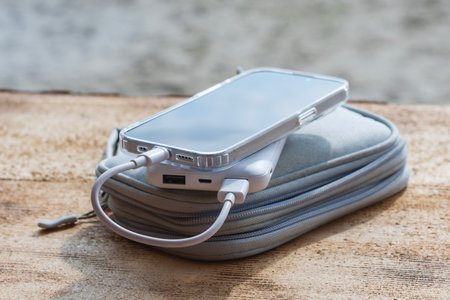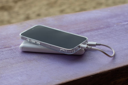 Smartphone is visibly charging from a power bank on a wooden table with a blurred backdrop of a sandy beach. Concept portable technology for leisure and travel