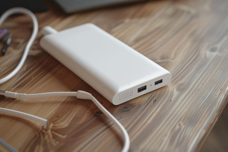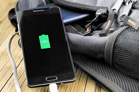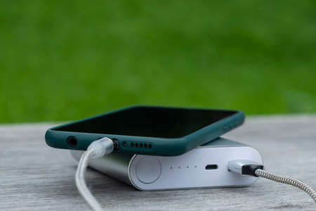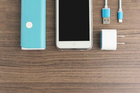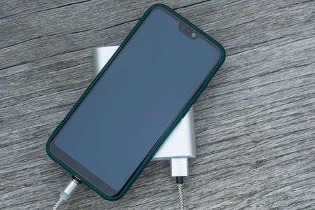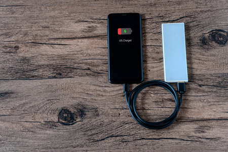 Smartphone is charging with backup battery or white power bank on the desk wooden table