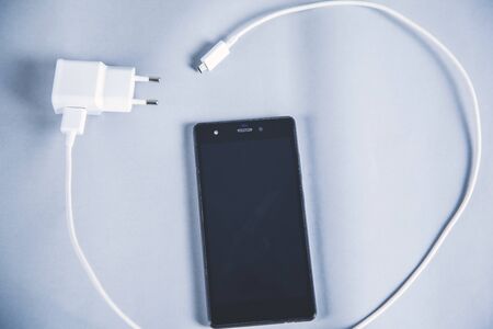 new smartphone with a black screen with a white wire from the charger on a gray background top view close-up, black and white photo with a vignette