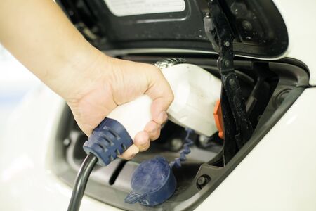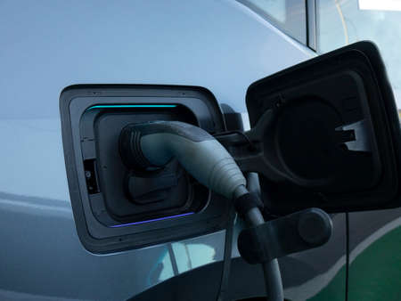 Charging an electric car. Close-up of a power source connected to a charging electrical vehicle.