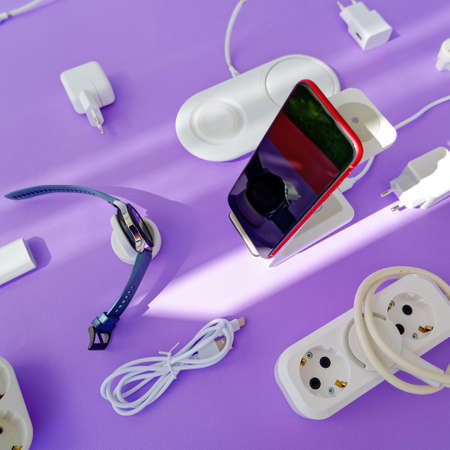 The concept of wireless charging of mobile gadgets. The smartphone and smartwatch are on the wireless charging pad. There are various adapters, cables and chargers nearby. Colored paper background.