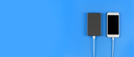 Top view smartphone charging with power bank on blue background with copy space. Smartphone charging with power bank by white USB cable.
