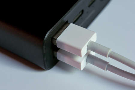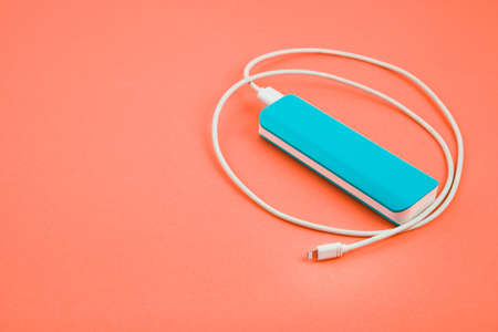 Charging power bank. Portable powerbank with white usb cable for charger mobile phone or smartphone battery. Modern technology concept in top view