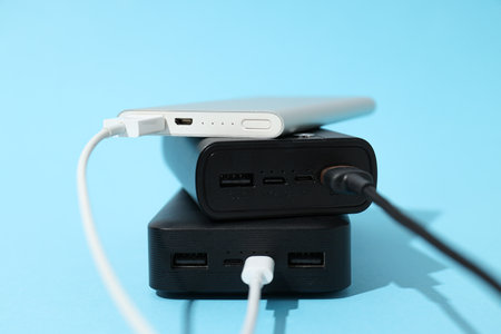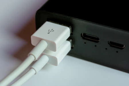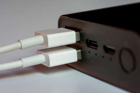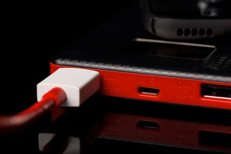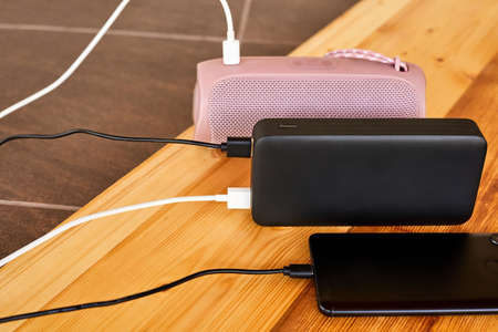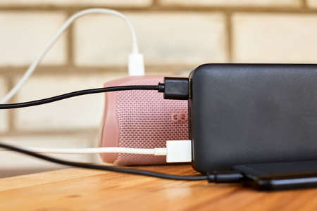 Powerbank charges smartphone and portable speaker using usb. Close-up, selective focus