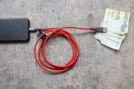 Phone power bank. Mobile phone or smartphone battery charging from portable powerbank with white usb cable. External battery for mobile devices with copy space