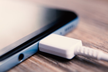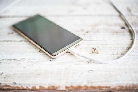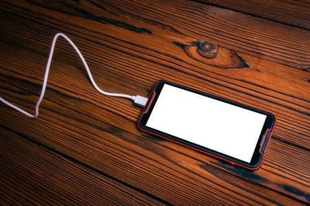 White phone charging cable plugged into a smartphone on a wooden desk at home. Smart technology and charging concept. Copy space for design, close up, selective focus