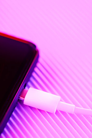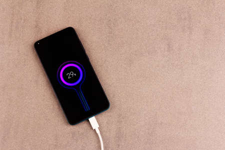 Smartphone charging on a purple background. Mobile phone with connected usb cable for battery charging. Fast charging concept
