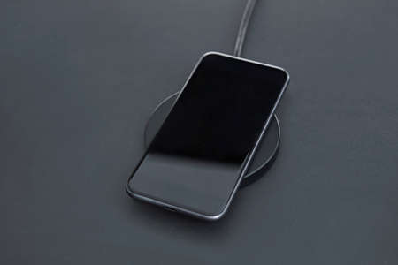 Close-up of luxury smartphone while recharging battery using wireless charger. Matt gray desk surface in background. Modern technology, wireless device and transfer of energy concept.