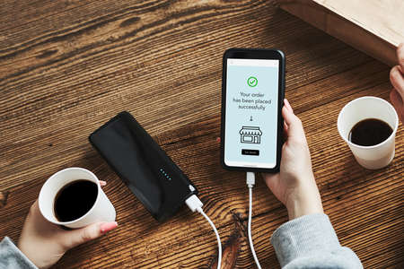 Online shopping. Buying online. Ordering product in online shop using smartphone. Order confirmation on screen. Online banking. People paying online. Paying for online shopping while charging mobile phone from powerbank in coffee shop