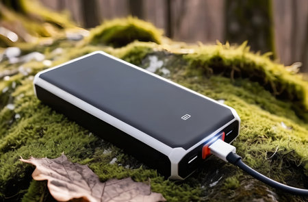 Large portable Power Bank in black with USB-C charging cable on a soft light background. Power source for charging smartphones and devices on the go